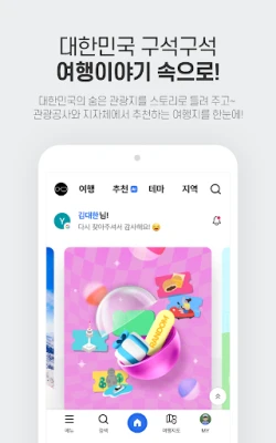 나만의 특별한 여행을 설계하고 싶다면 "대한민국구석구석"이 도와드립니다. 직관적인 사용자 여행 코스 기능을 통해 꿈꾸던 여정을 미리 계획하고, 마음에 드는 콘텐츠는 즐겨찾기에 담아 언제든 다시 찾아볼 수 있습니다. 현재 위치를 기반으로 주변 관광지, 맛집, 숙박, 축제 정보까지 실시간으로 제공하며, 편리한 내비게이션 및 길 안내 서비스로 낯선 곳에서도 헤맬 걱정 없이 여행에만 집중할 수 있습니다. 네이버, 카카오톡, 페이스북 등 다양한 SNS 계정으로 간편하게 로그인하고, 소중한 여행 경험을 친구들과 손쉽게 공유하며 더욱 풍성한 추억을 만들어 가세요.