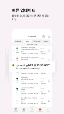 FxPro의 앱은 TradingView의 전체 화면 차트를 통한 심층적인 시장 분석과 MetaTrader 5 통합 기능을 제공하여 전문가 수준의 인사이트를 얻을 수 있도록 돕습니다. 실시간 주식 시황, 다양한 지표, 그리고 중요한 시장 움직임에 대한 푸시 알림과 통합 경제 캘린더를 통해 한 발 앞서 투자 기회를 포착하세요. 리스크 없는 데모 거래로 실력을 갈고 닦고, FxPro Wallet을 활용한 체계적인 리스크 관리로 현명한 투자를 이어갈 수 있습니다. 원탭 거래와 낮은 스프레드는 신속하고 유리한 거래 환경을 조성하며, 다국어 지원 및 24/5 라이브 채팅 서비스는 언제든 궁금증을 해결하고 도움을 받을 수 있도록 지원합니다. FxPro와 함께라면 누구나 프로처럼 편리하게 투자할 수 있습니다.