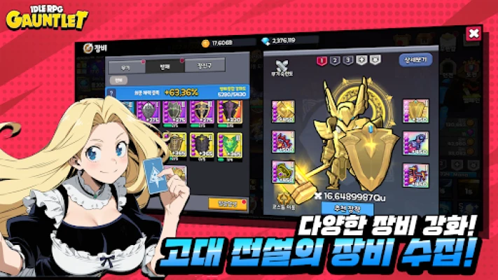 끝없이 샘솟는 성장과 수집의 재미가 '건틀렛'의 핵심입니다. 접속하지 않아도 전설적인 장비와 희귀 아이템이 저절로 쌓이며, 당신의 영웅은 더욱 강해집니다. 검, 방패, 신비로운 장신구들을 수집하고 강화하며 끝없이 심연의 던전으로 나아가세요. 획득하는 다양한 능력들로 자신만의 방식으로 영웅을 육성하고, 오프라인 상태에서도 쏟아지는 풍성한 보상으로 성장의 가속도를 붙일 수 있습니다. 강력한 아이템들이 선사하는 압도적인 전투력 상승을 직접 확인하십시오.