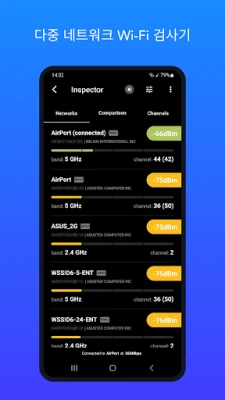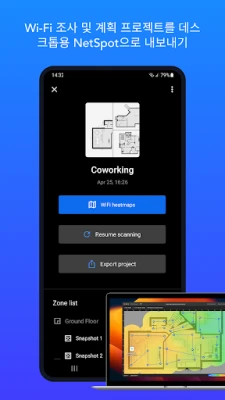 NetSpot은 그 자체로 완벽한 도구일 뿐만 아니라, 데스크톱 버전의 훌륭한 파트너 역할도 수행합니다. Android에서 생성한 Wi-Fi 조사 및 계획 프로젝트를 macOS나 Windows용 NetSpot으로 내보내 더욱 심층적인 분석과 보고서 작성을 이어갈 수 있습니다. 무료 NetSpot 앱은 기본적인 검사기 기능과 정확한 인터넷 속도 테스트를 제공하여 여러분의 네트워크 상태를 손쉽게 확인할 수 있게 합니다. 하지만 예측 히트맵, 상세한 무선 채널 분석, 실시간 데이터 시각화, 그리고 포괄적인 무선 사이트 조사와 같은 전문가 수준의 기능들은 NetSpot Plus(앱 내 구매)를 통해 경험하실 수 있습니다. 특별한 기술이나 추가 장비 없이도, NetSpot은 모든 사용자가 Wi-Fi의 잠재력을 최대한 발휘할 수 있도록 지원합니다.