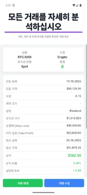 성공적인 트레이더가 되기 위한 핵심은 일관된 자기 성찰과 전략 개선입니다. TrackIt과 함께라면 모든 거래를 세부 메모와 스크린샷과 함께 꼼꼼히 기록하며, 과거 데이터를 바탕으로 실수에서 배우고 수익성 높은 패턴을 명확히 찾아낼 수 있습니다. 승률, 평균 수익률, 최대 손실폭 등 핵심 성과 지표를 실시간으로 추적하여, 단순히 감에 의존하는 것이 아닌 데이터 기반의 정교한 트레이딩 전략을 구축하고 견고하게 다질 수 있습니다.